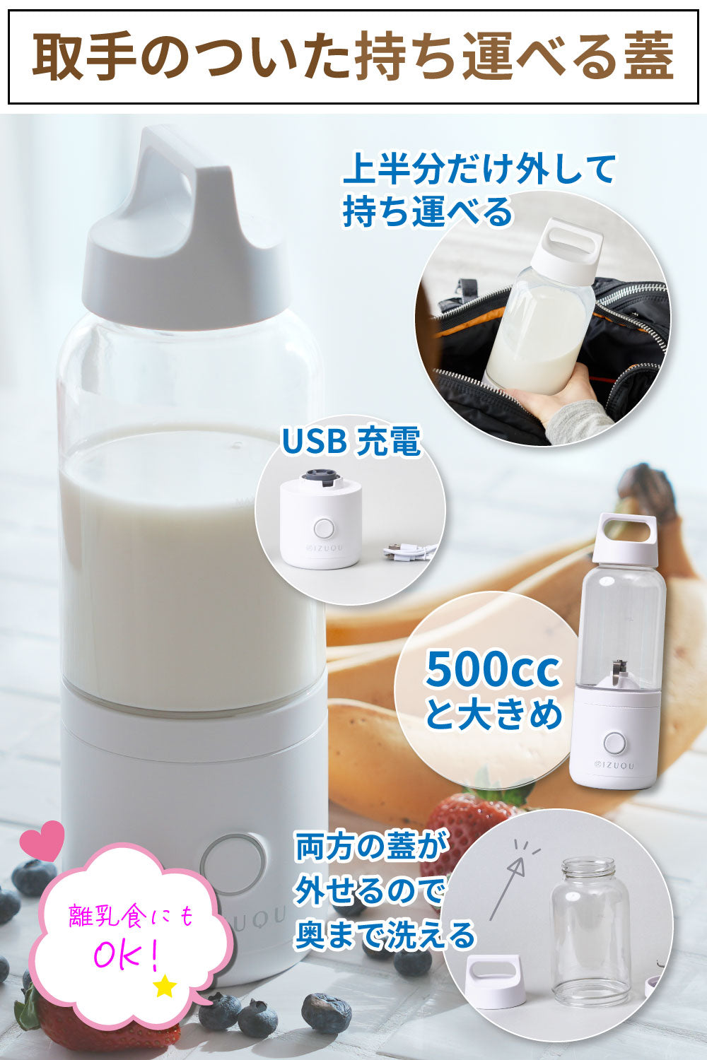 スムージーやジュースとして使うだけでなく普段にミキサーとしてソースや離乳食などにも作るときにも!