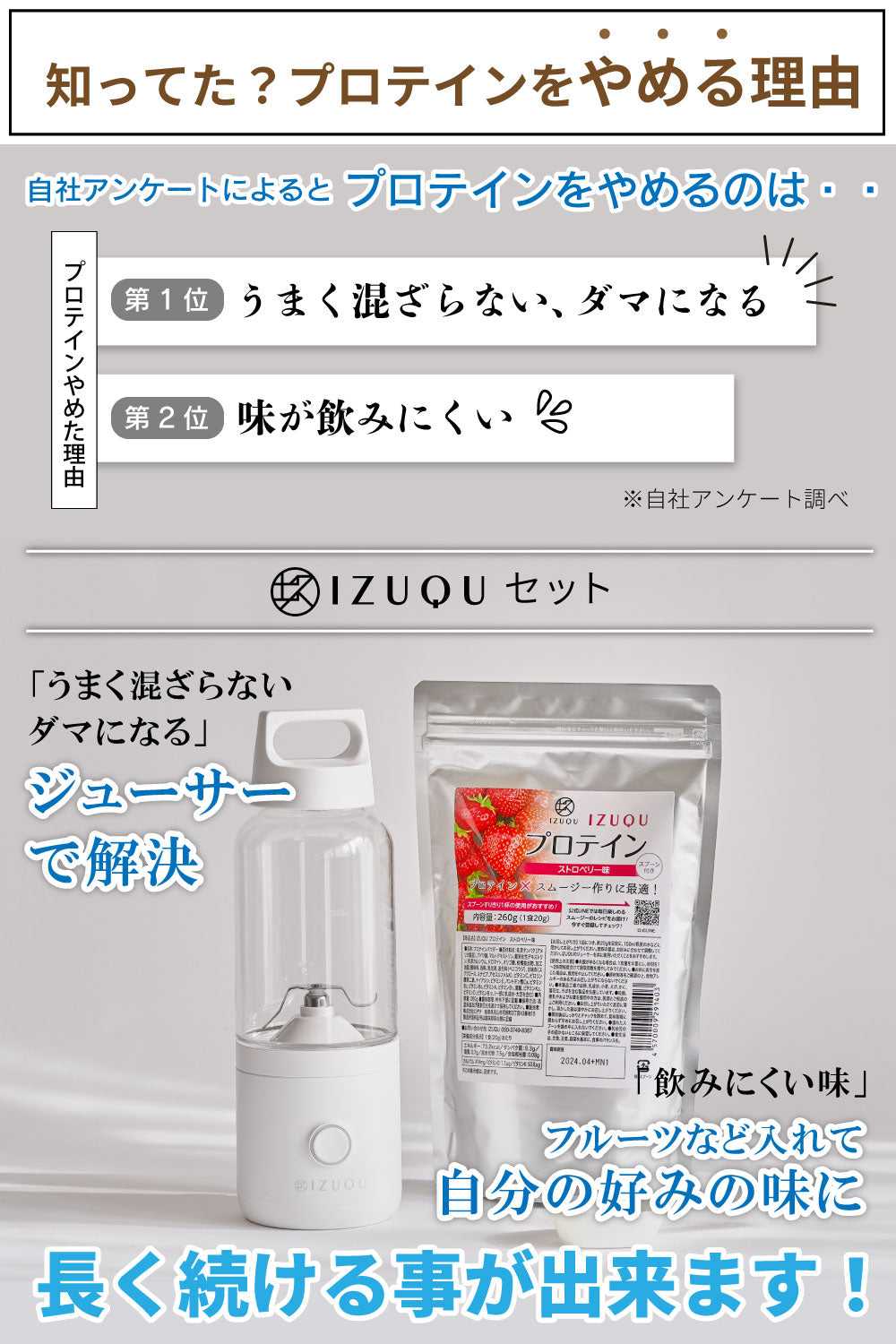 IZUQU専用プロテインスムージーと一緒に使用していただくことによって朝食の代わりに美味しい スムージー に!